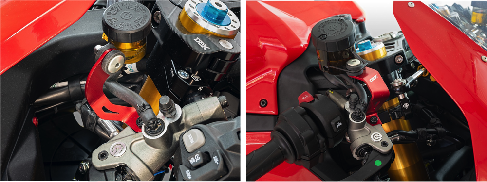 Our Ducabike / DBK “RACE” reservoir brackets are specifically designed for our lower race handlebar clamps BSRA50D so the reservoirs do not foul the fairing when installed.