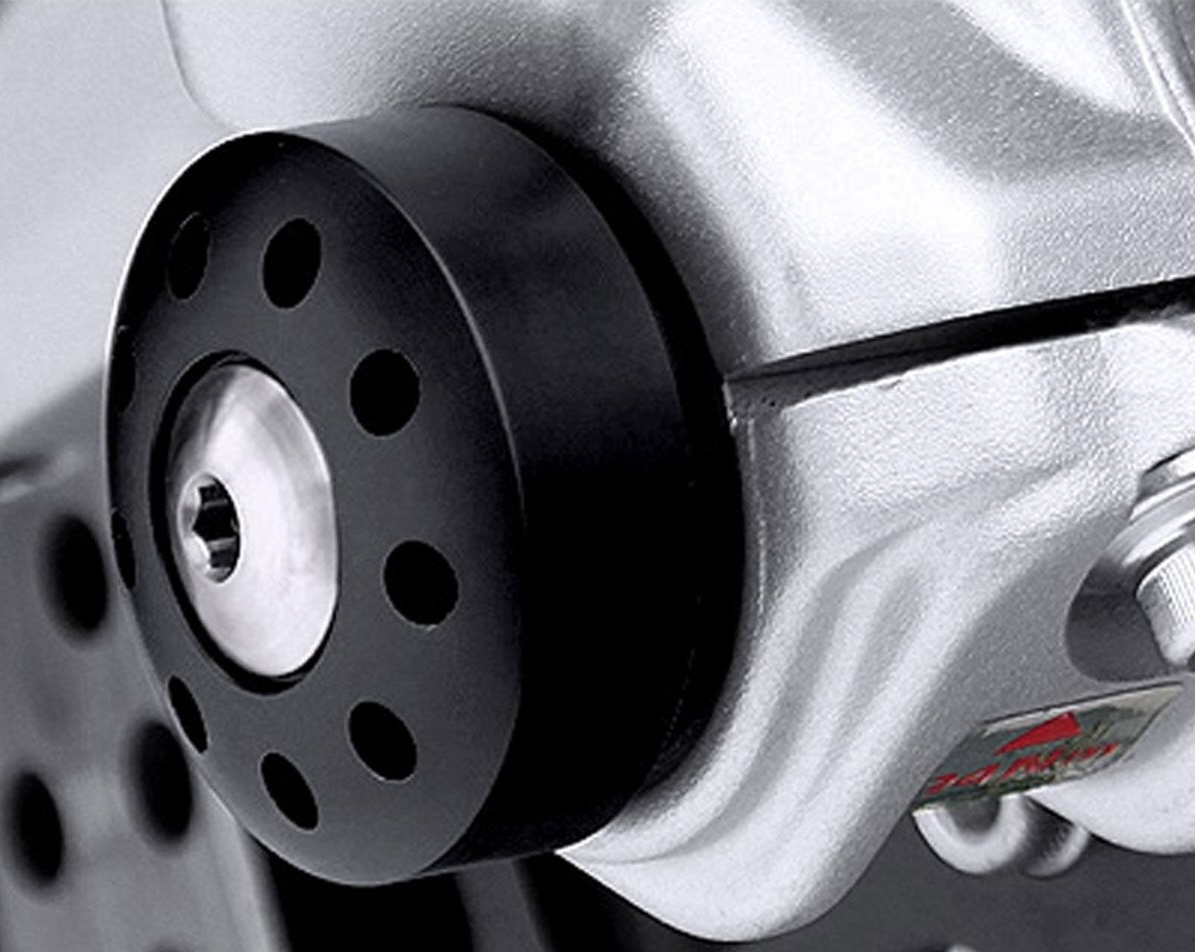 This configuration provides essential protection in the event of a fall or slide. Both sections are securely held by a billet aluminium centre pin/tie and two custom-made titanium screws, exclusively from Motocorse. The anodised aluminium centre pin is crafted to resist rust, making the kit suitable for all weather conditions. Anodization is an electrolytic passivation process that increases the thickness of the oxide layer on metal components, enhancing durability.