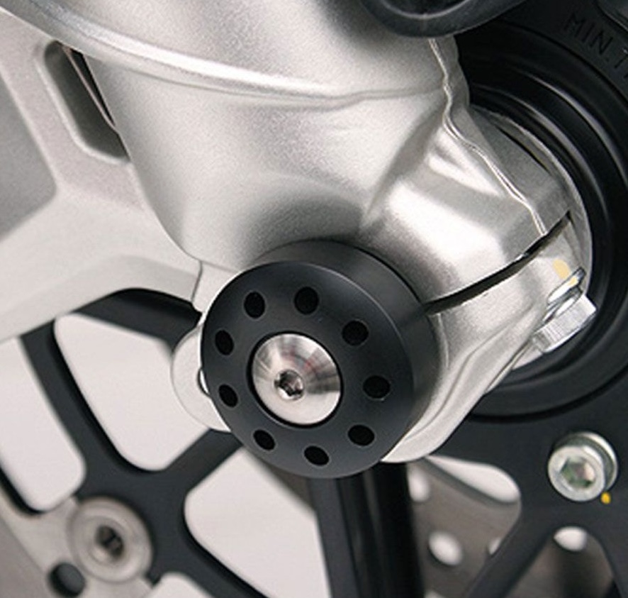 The special front wheel axle sliders are precisely crafted from Delrin blocks, a plastic renowned for its dimensional stability, strength, and hardness. The dome-shaped sliders are designed to fully cover the bulk nut and its clip on the wheel side, while protecting the crown nut, which remains visible.